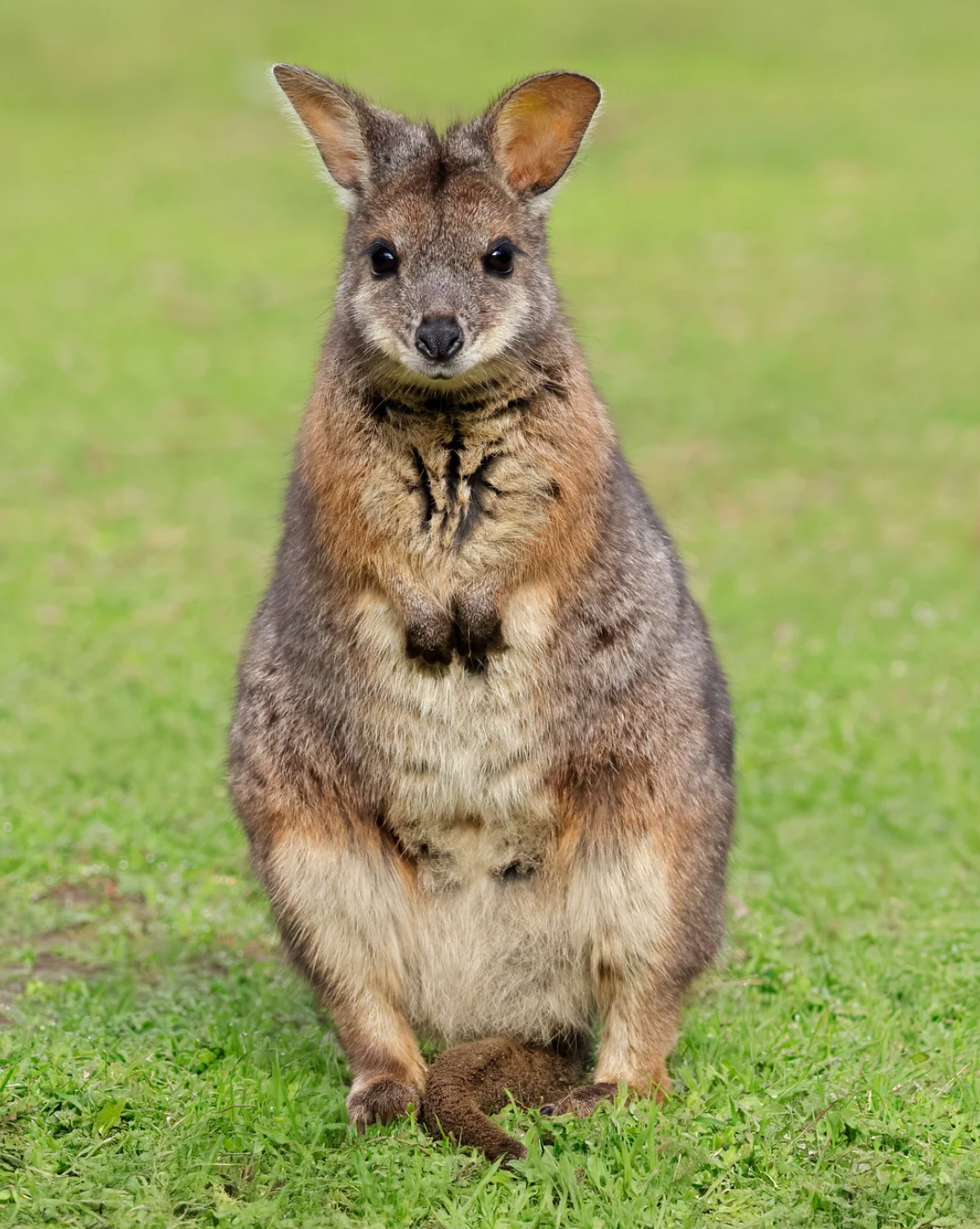 写真の右下あたりにこちらを見ている子が、タマーワラビーです。ワラビーとはカンガルー科の生き物で、カンガルーと同じようにお腹に袋を持ち、カンガルーより一回り小さいのが特徴です。ぴょんぴょんと飛び回ります。