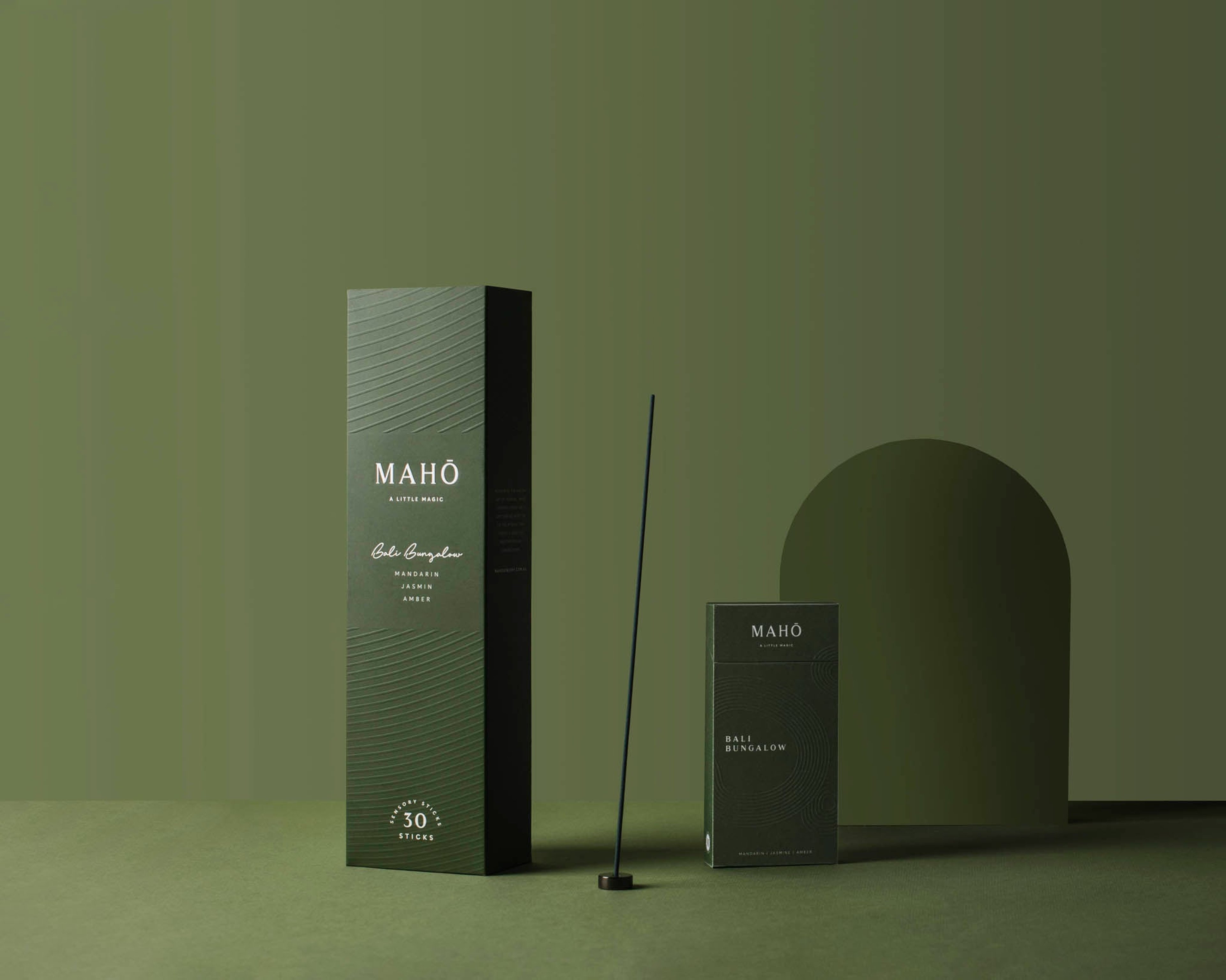 Light the tip of one incense over fire. Extinguish the flame by blowing or fanning. Incense should emit a glowing ember and fragrance with smoke. Return smouldering Sensory Stick to the MAHŌ Incense burner.