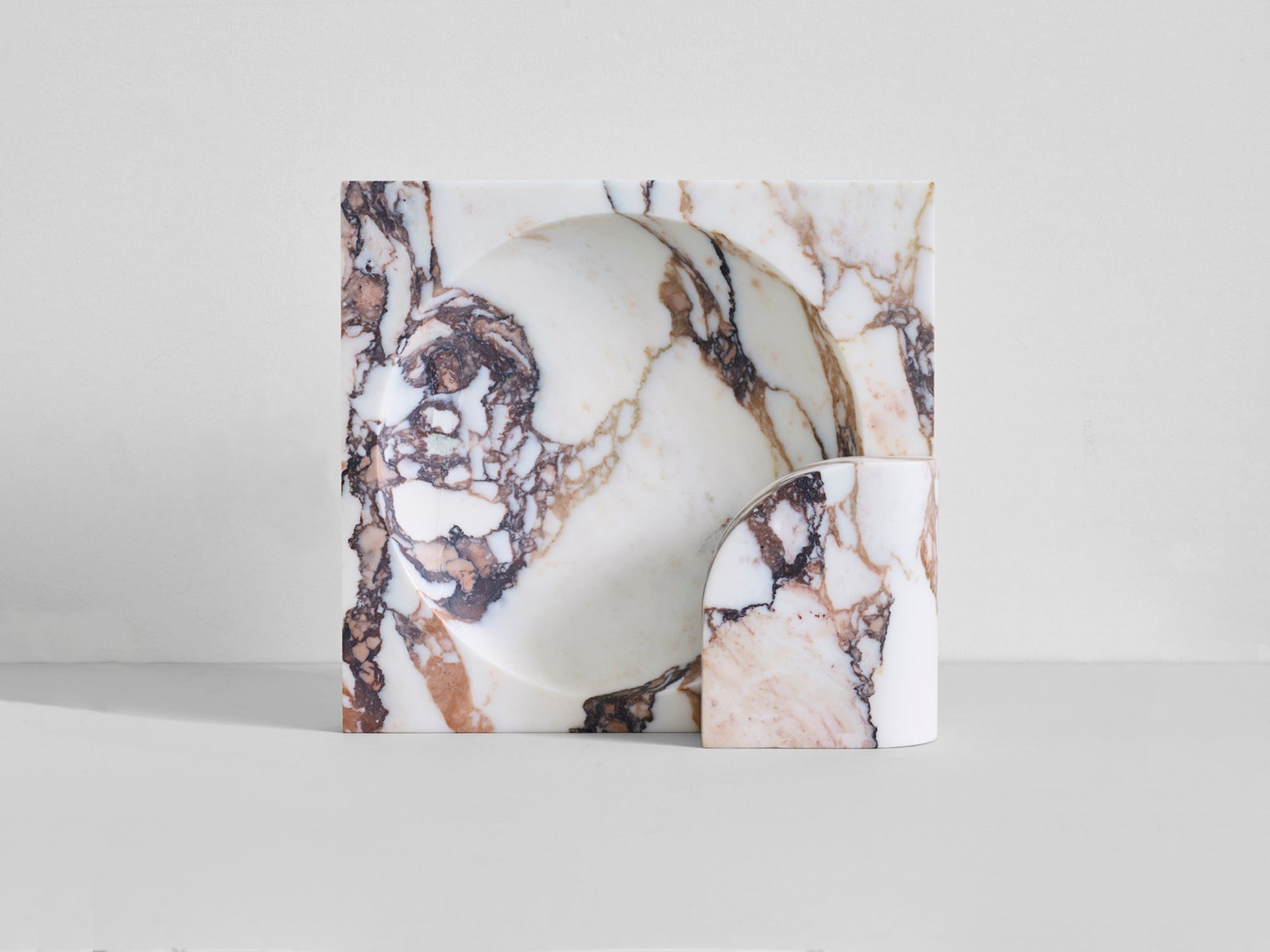 A lamp of elegant minimalist forms and gentle asymmetry, the Block Sconce comprises two pieces of natural stone connected by a concealed mount – a small front plate projecting light both onto and upwards from a rear plate. The former’s single curve sits in pleasing geometric contrast with the latter – an upright square with a dominant circular concavity.