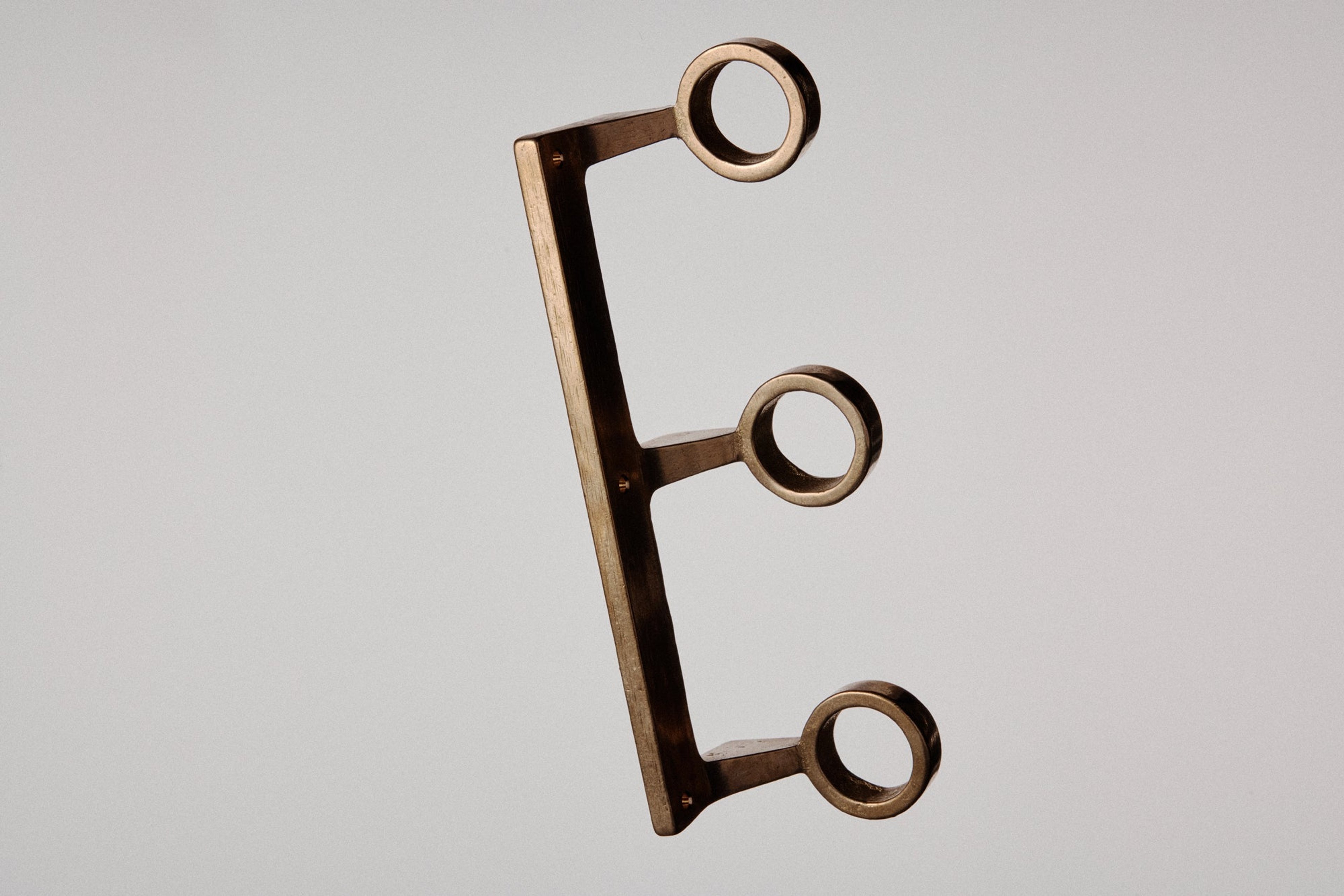 The Bottle Bracket is manufactured in small batches, slight variations will occur from piece to piece. Production marks may include slight pour ripples or surface pitting. They will arrive with a bright finish but will oxidise and darken over time to reveal a distinctive patina. Simply use a metal polish to restore a like-new finish.
