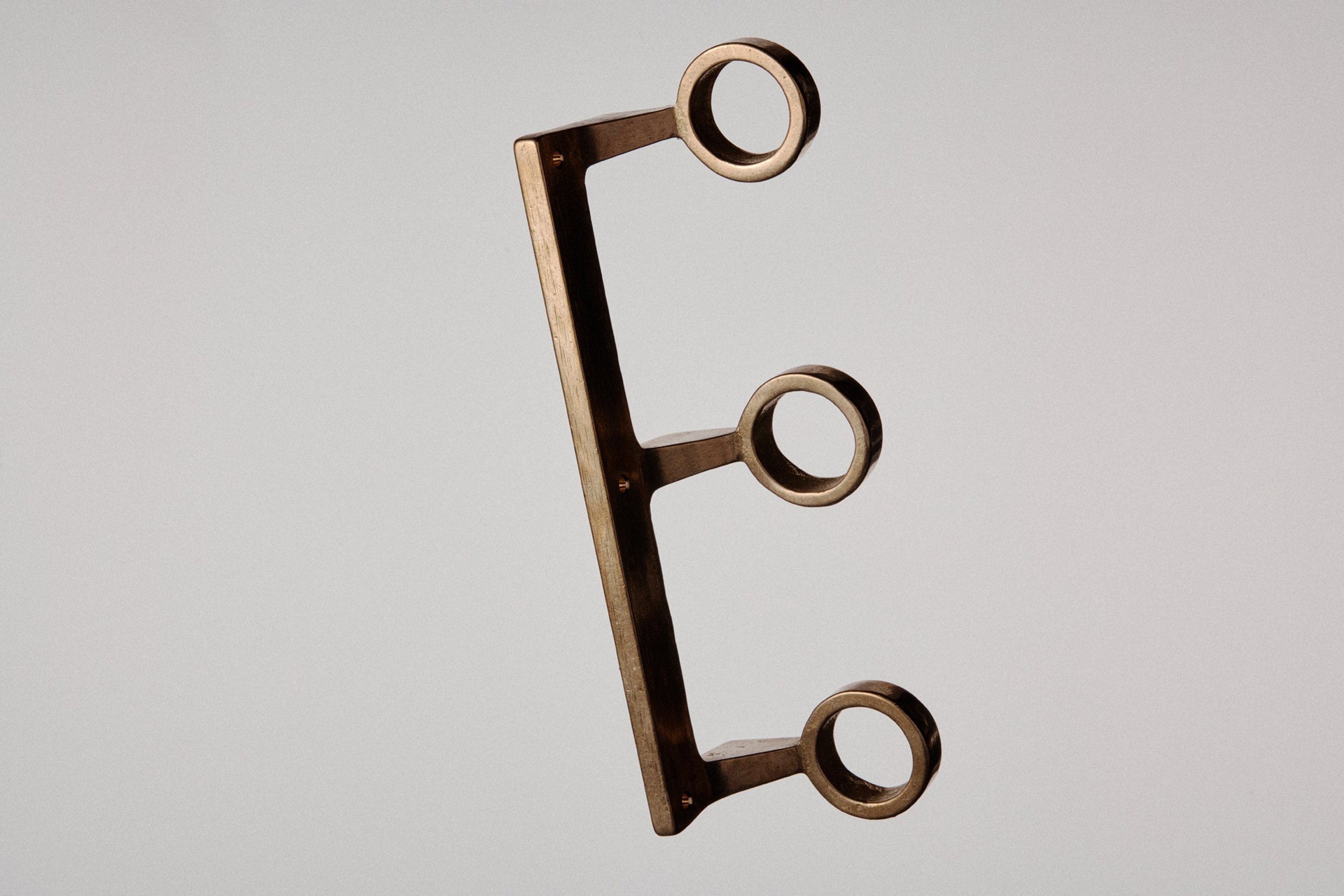Bottle Bracket is a solid, hand poured brass form available in dual or single bottle configuration.