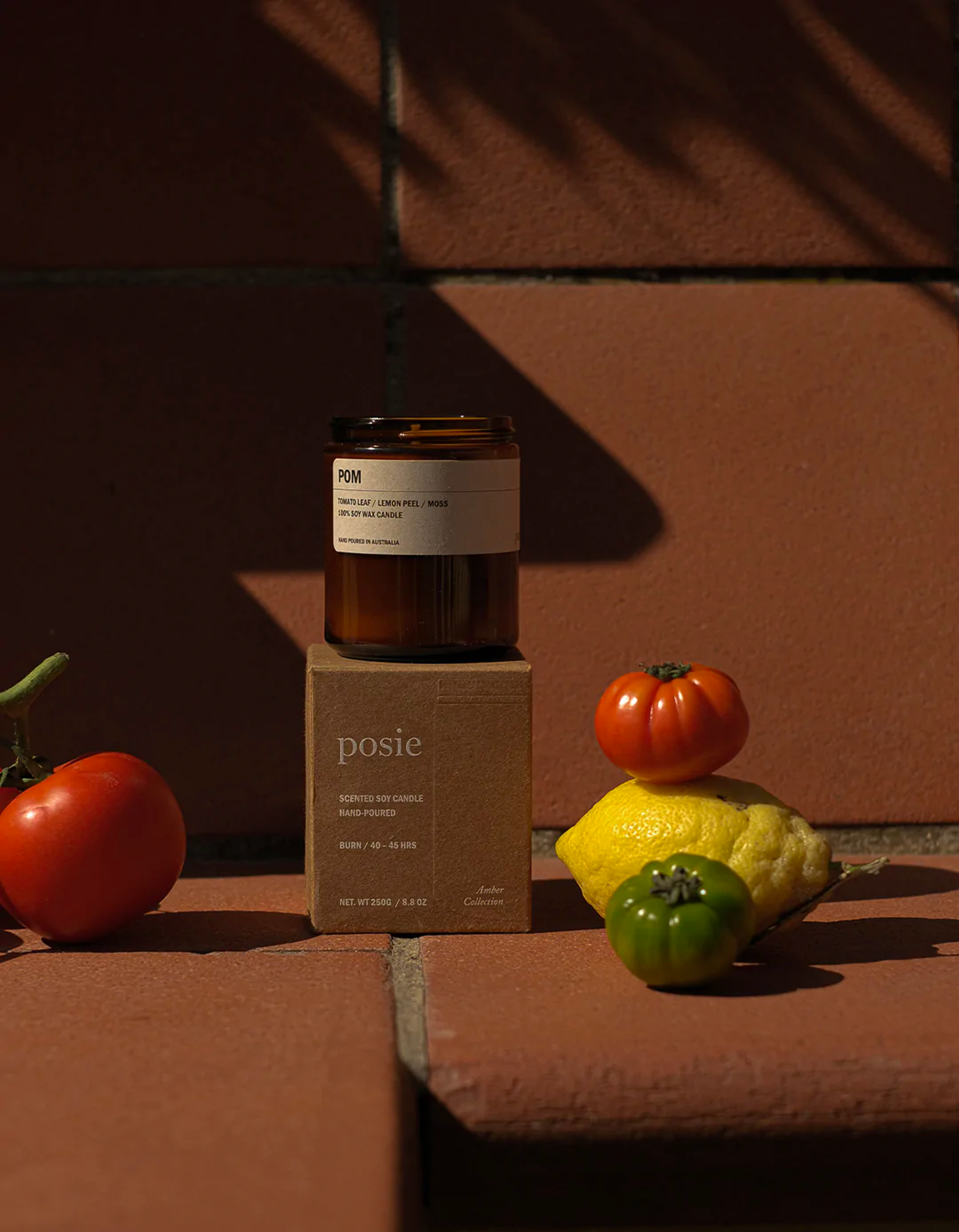 Natural 100% soy wax candle set in an amber glass jar, topped with an aluminium screw top lid.
