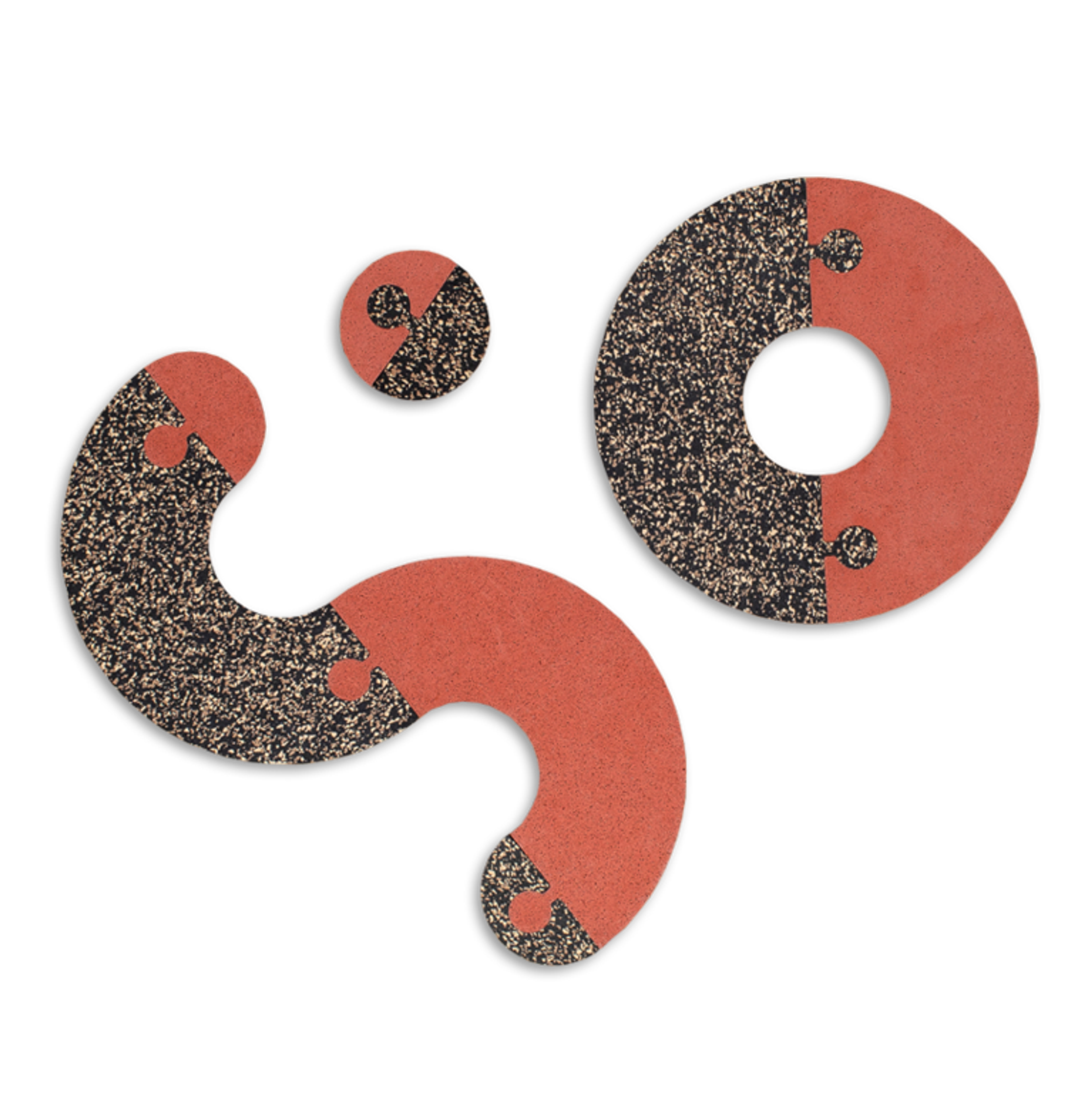 Puzzle placemats are an interactive and playful tableware set. Made from durable and heat resistant recycled aeroplane tyres and new rubber, they will protect your favourite surfaces, while also looking ridiculously good. Designed to loosen up dinner table formalities and promote engagement, play with the set, pull the shapes apart and reassemble into new configurations and functions: a coaster, a placemat, a trivet, or maybe just a playful table topper.