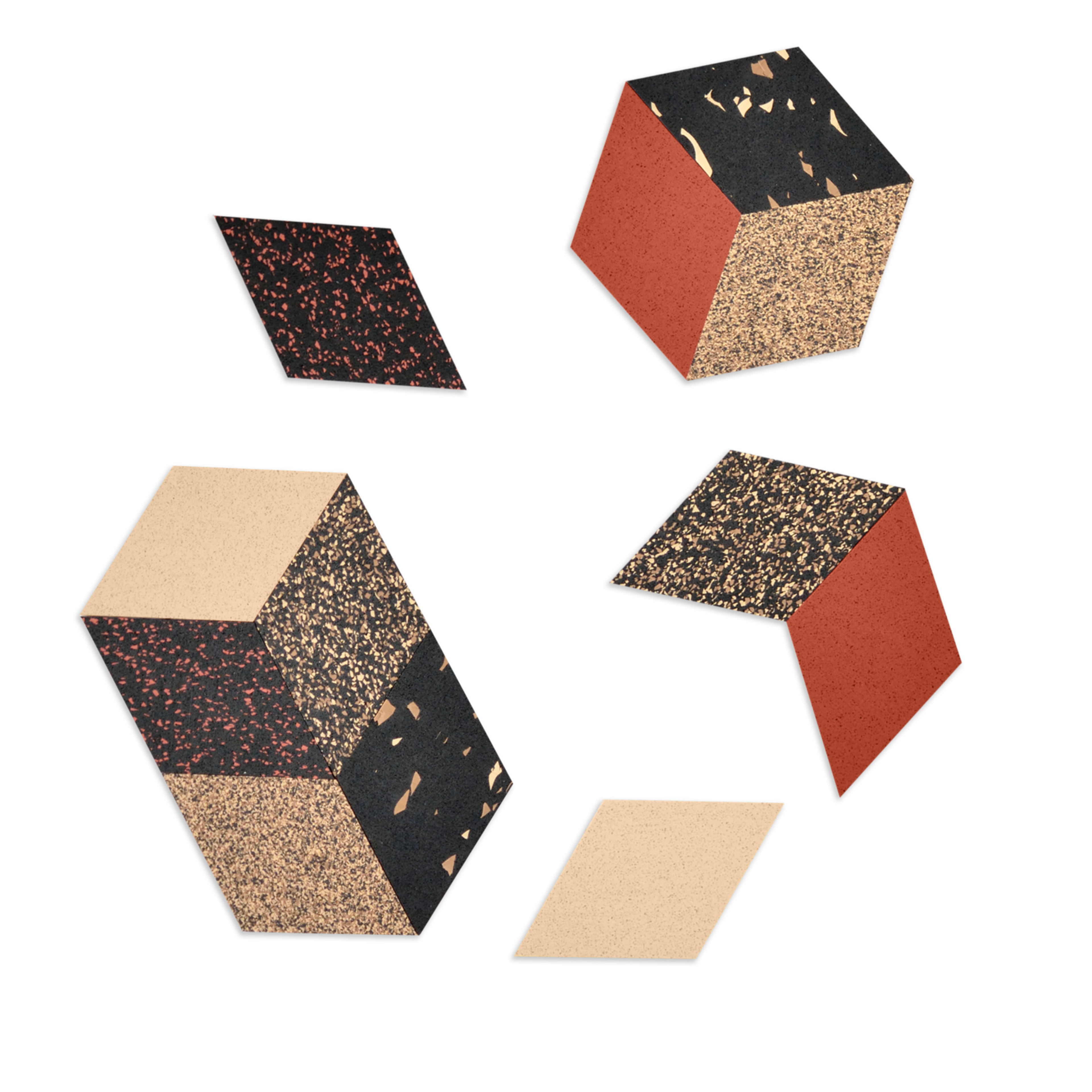 Our Rhombus series was the first product range launched by Champ Co range and continues to delight and surprise people at the table. Made from durable and heat resistant recycled aeroplane tyres and new rubber, these serve as trivets and coaster will protect your favourite surfaces from hot drinks and food, while also looking ridiculously good. Designed to loosen up dinner table formalities and promote engagement, play with the set by creating a variety of tessellated shapes together with your loved ones.