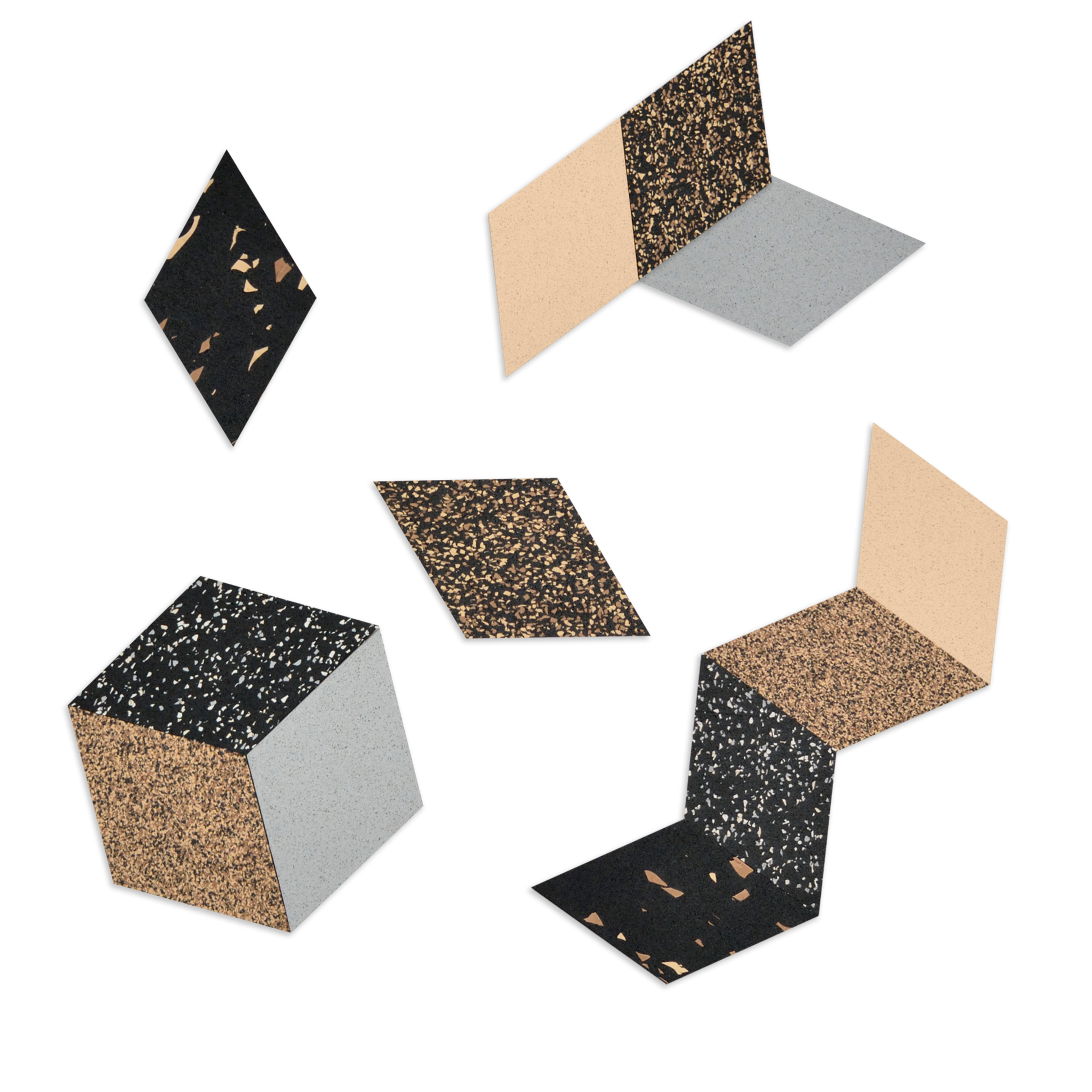 Our Rhombus series was the first product range launched by Champ Co range and continues to delight and surprise people at the table. Made from durable and heat resistant recycled aeroplane tyres and new rubber, these serve as trivets and coaster will protect your favourite surfaces from hot drinks and food, while also looking ridiculously good. Designed to loosen up dinner table formalities and promote engagement, play with the set by creating a variety of tessellated shapes together with your loved ones.