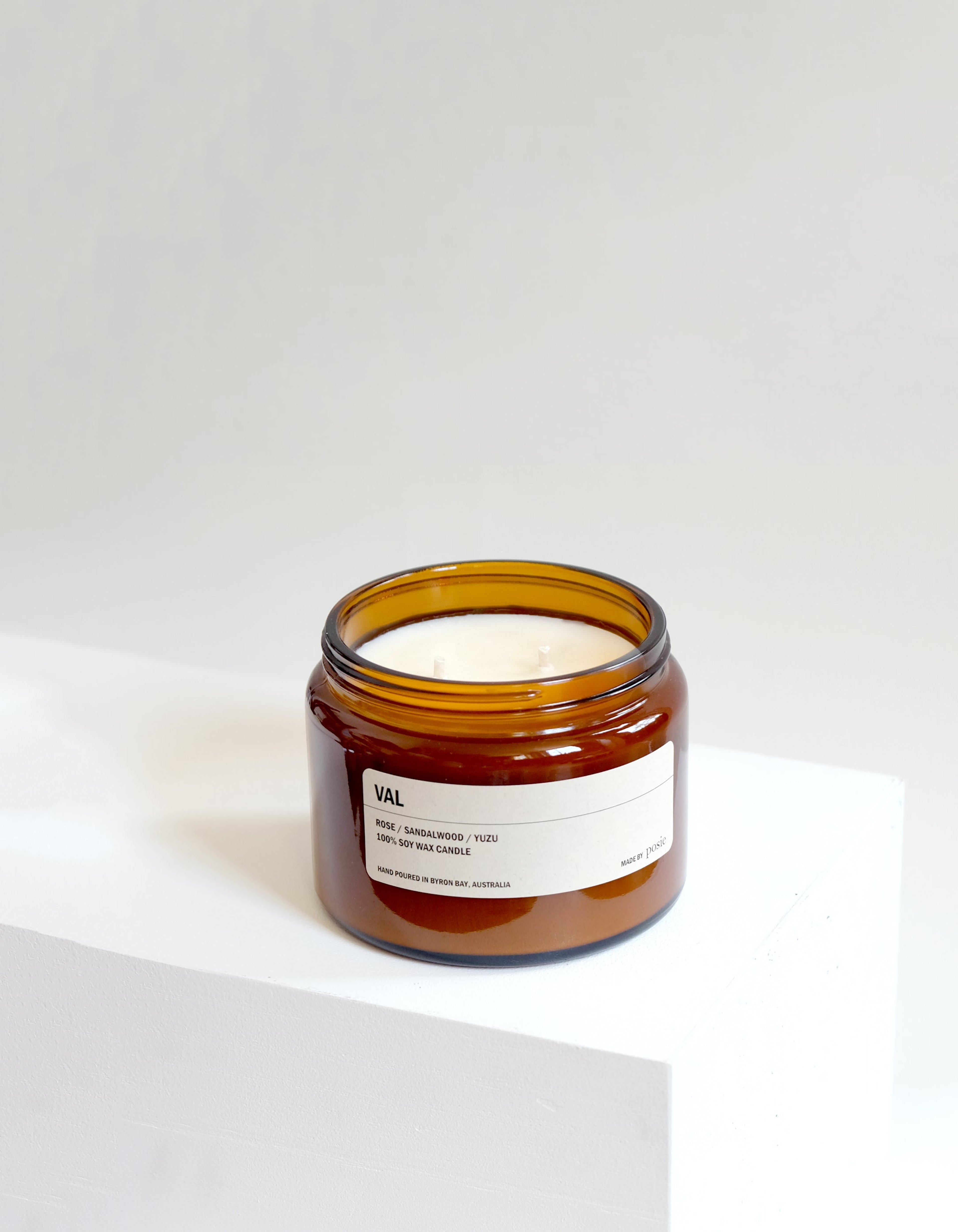 Natural 100% soy wax candle set in an amber glass jar, topped with an aluminium screw top lid.