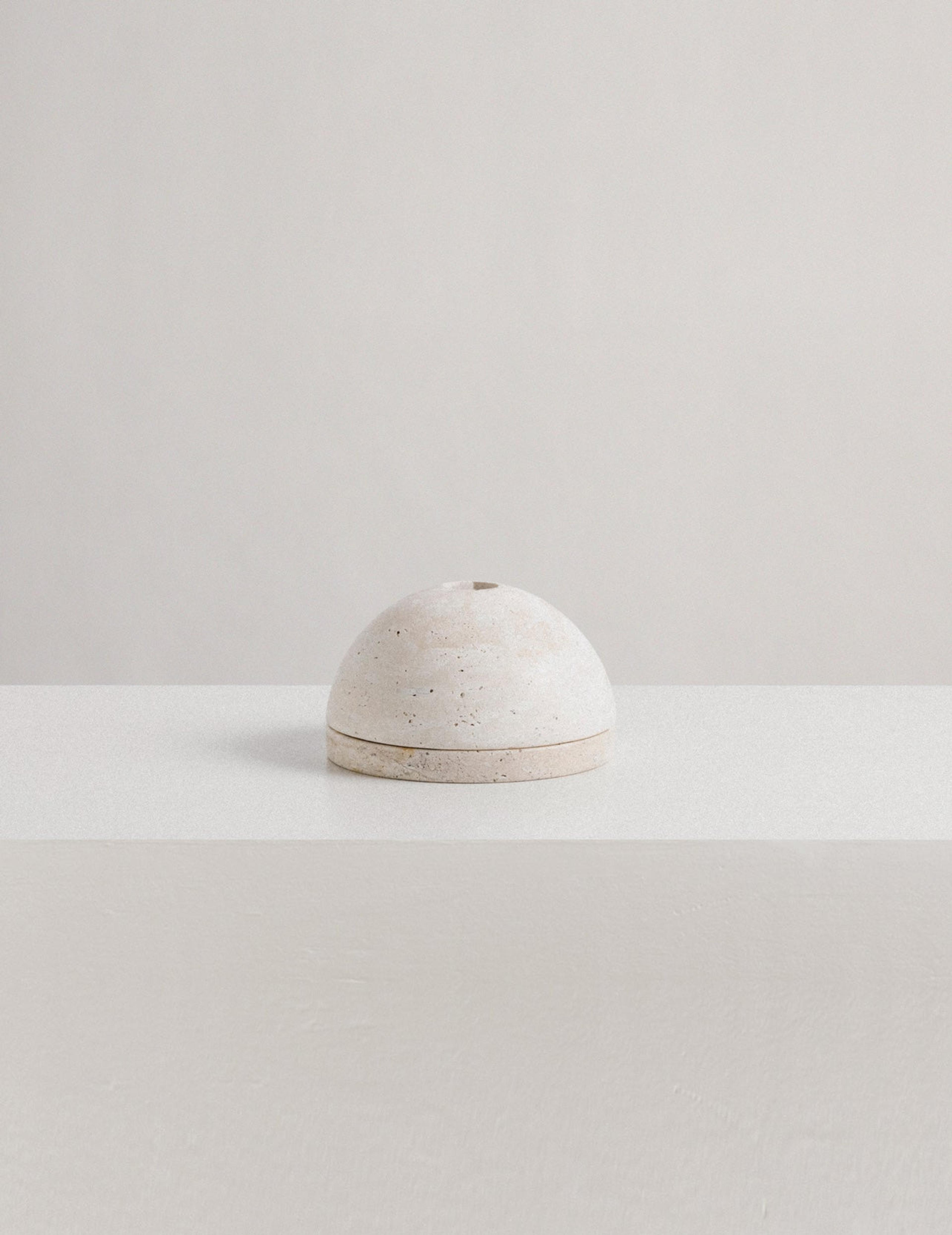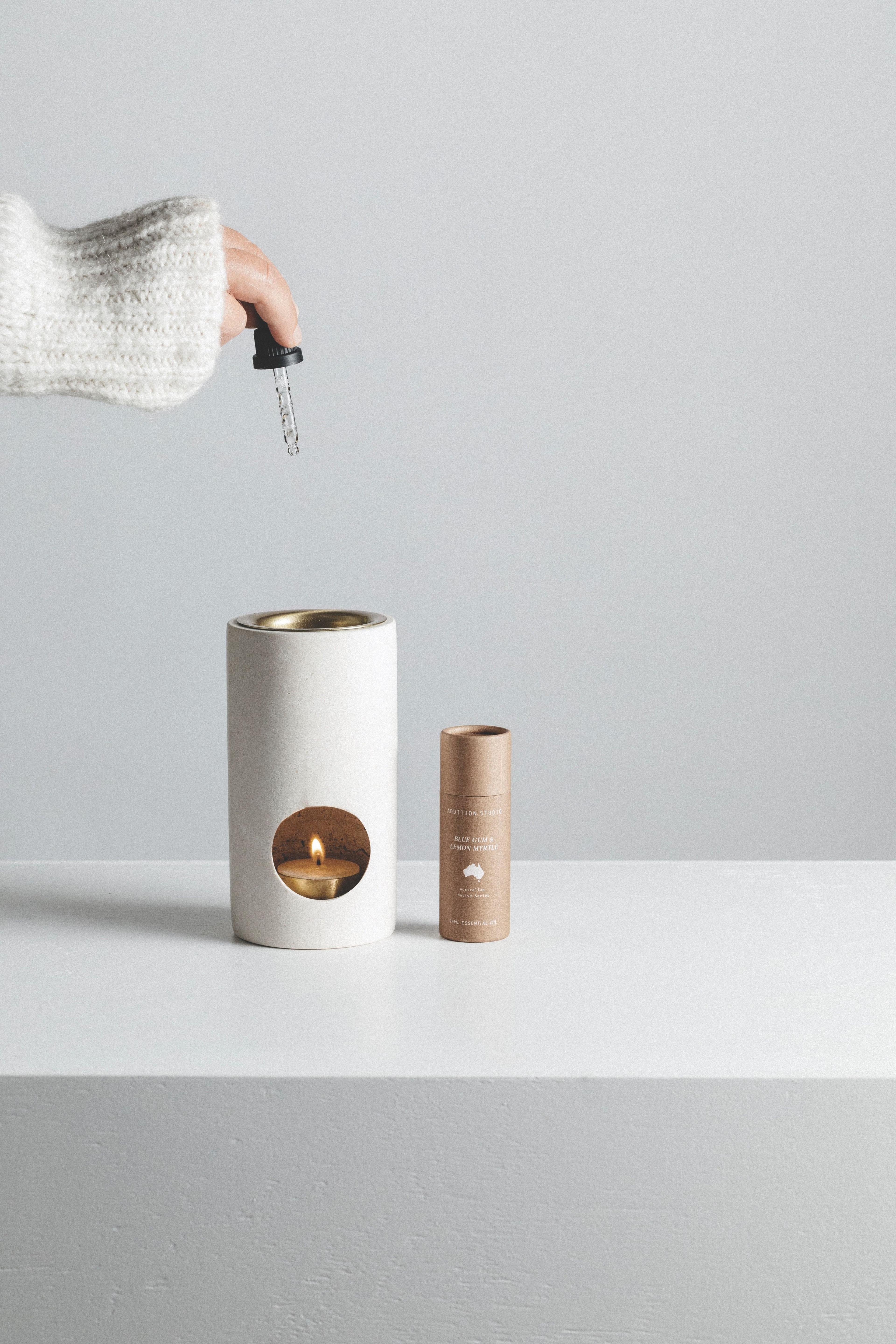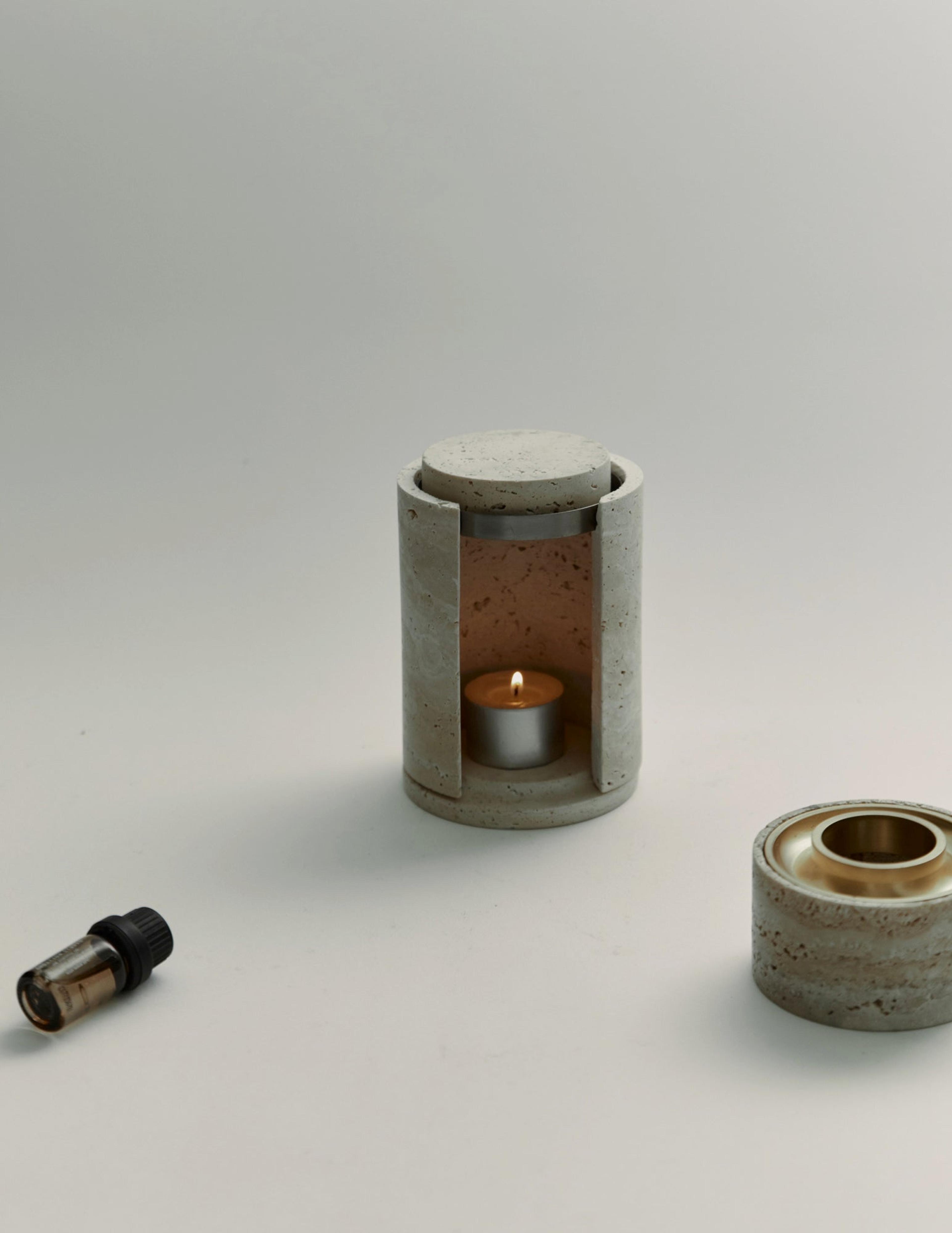 A minimalistic oil burner carved from solid stone featuring warm brass accents. This oil burners cylindrical design allows for the candle heat to directly warm the deep brass dish for enhanced aroma time. The Synergy Oil Burner comes with a 100% organic beeswax tea light candle and 15 mL Lavender essential oil. Available in Limestone, Travertine and Black Marble.