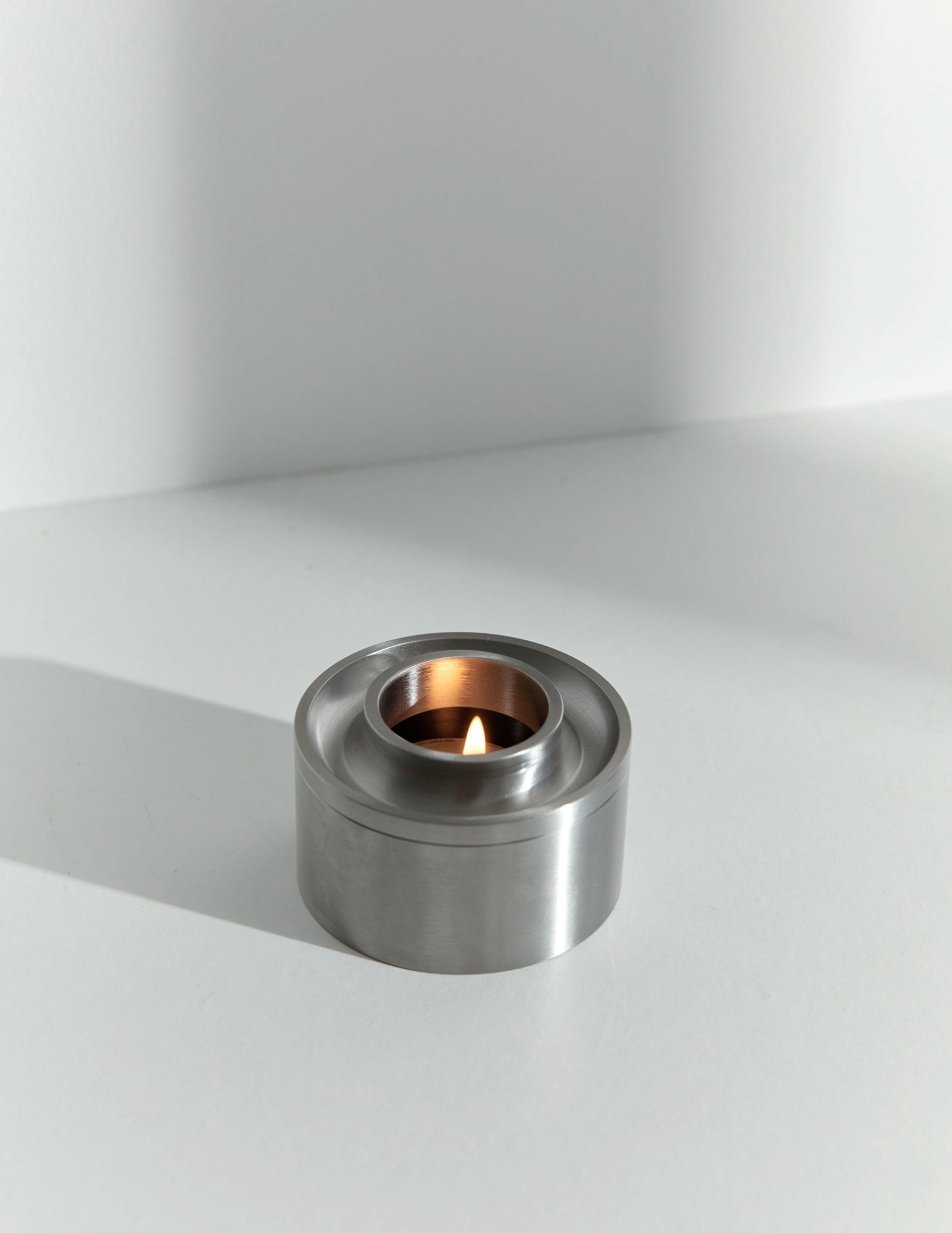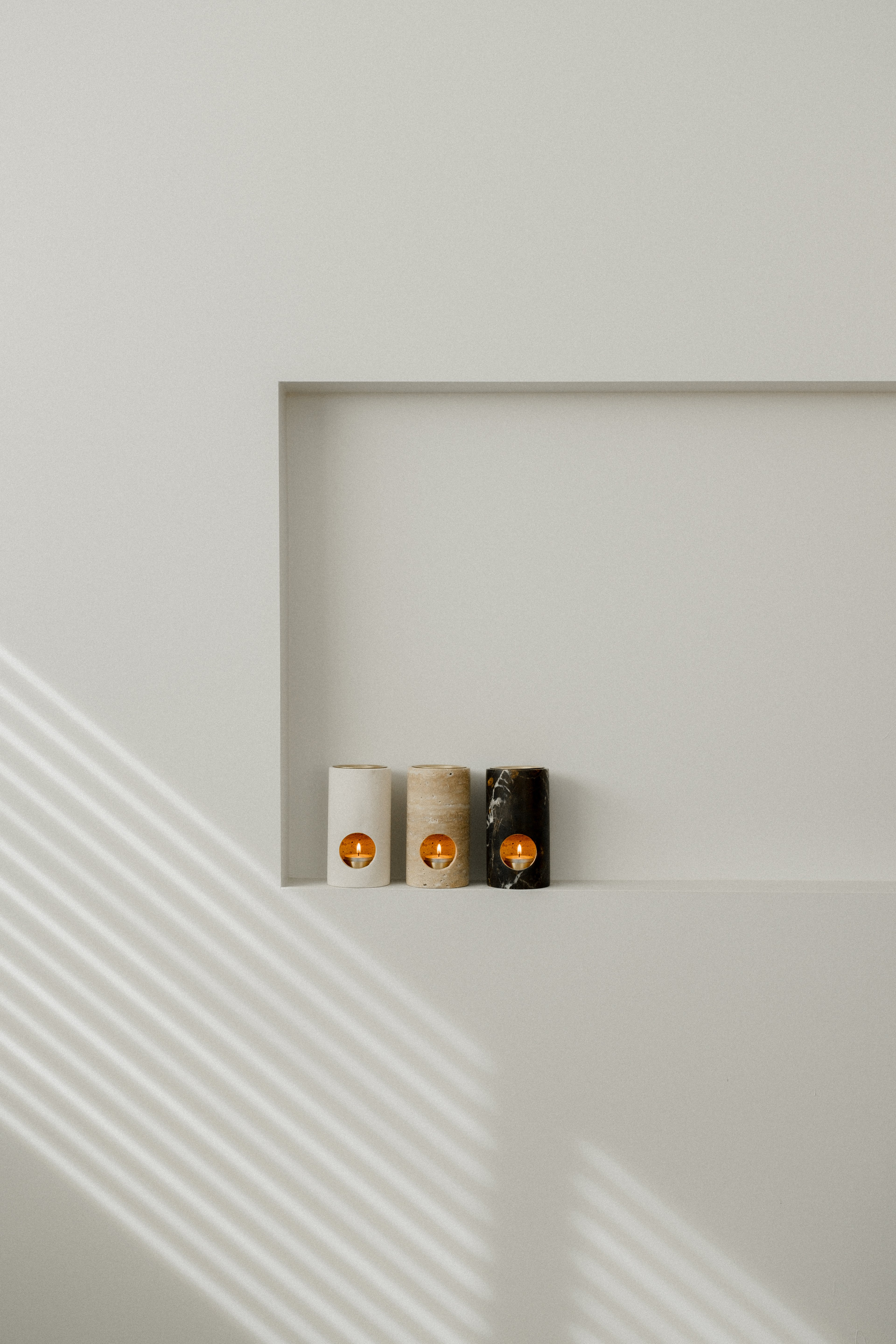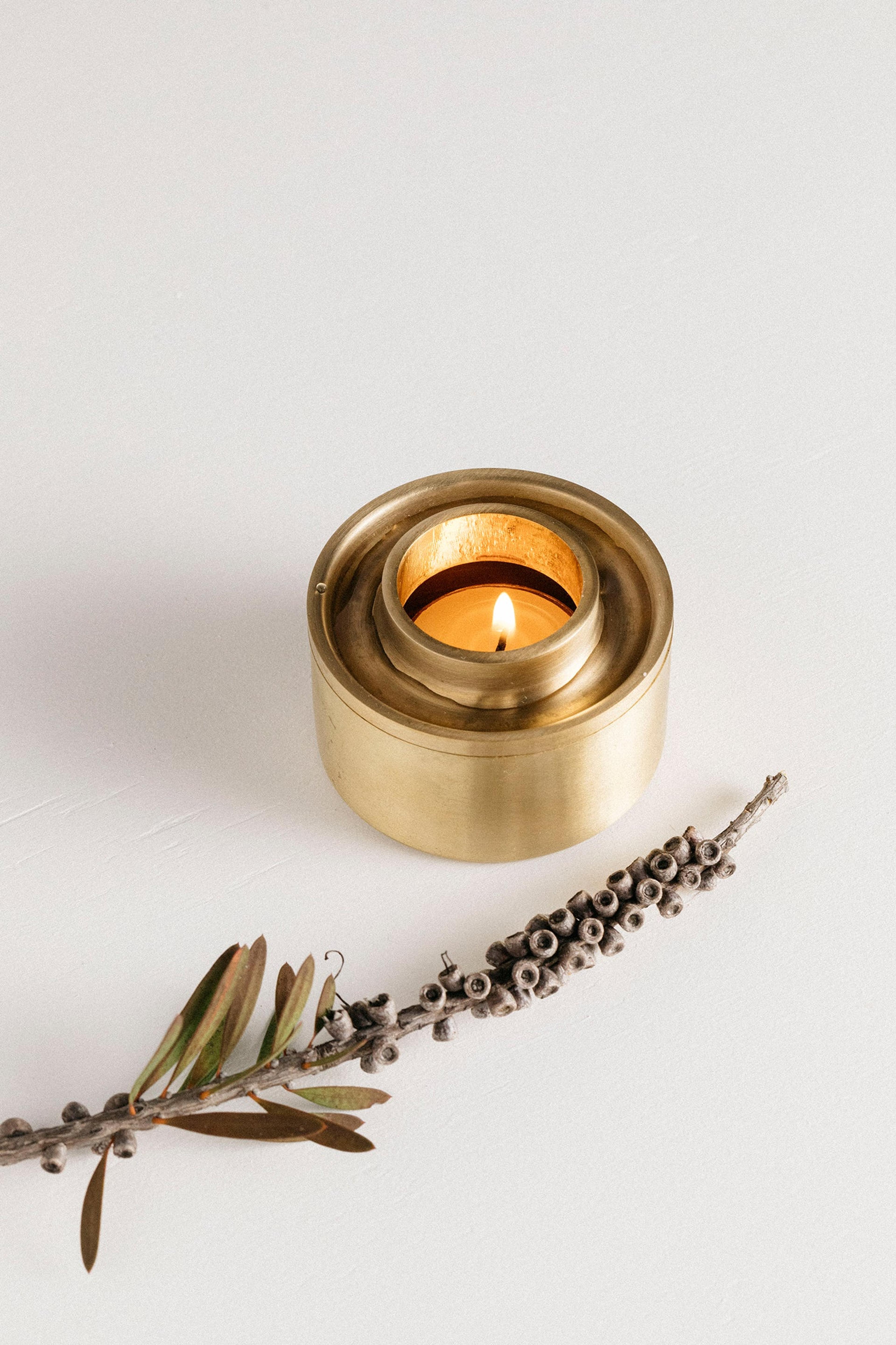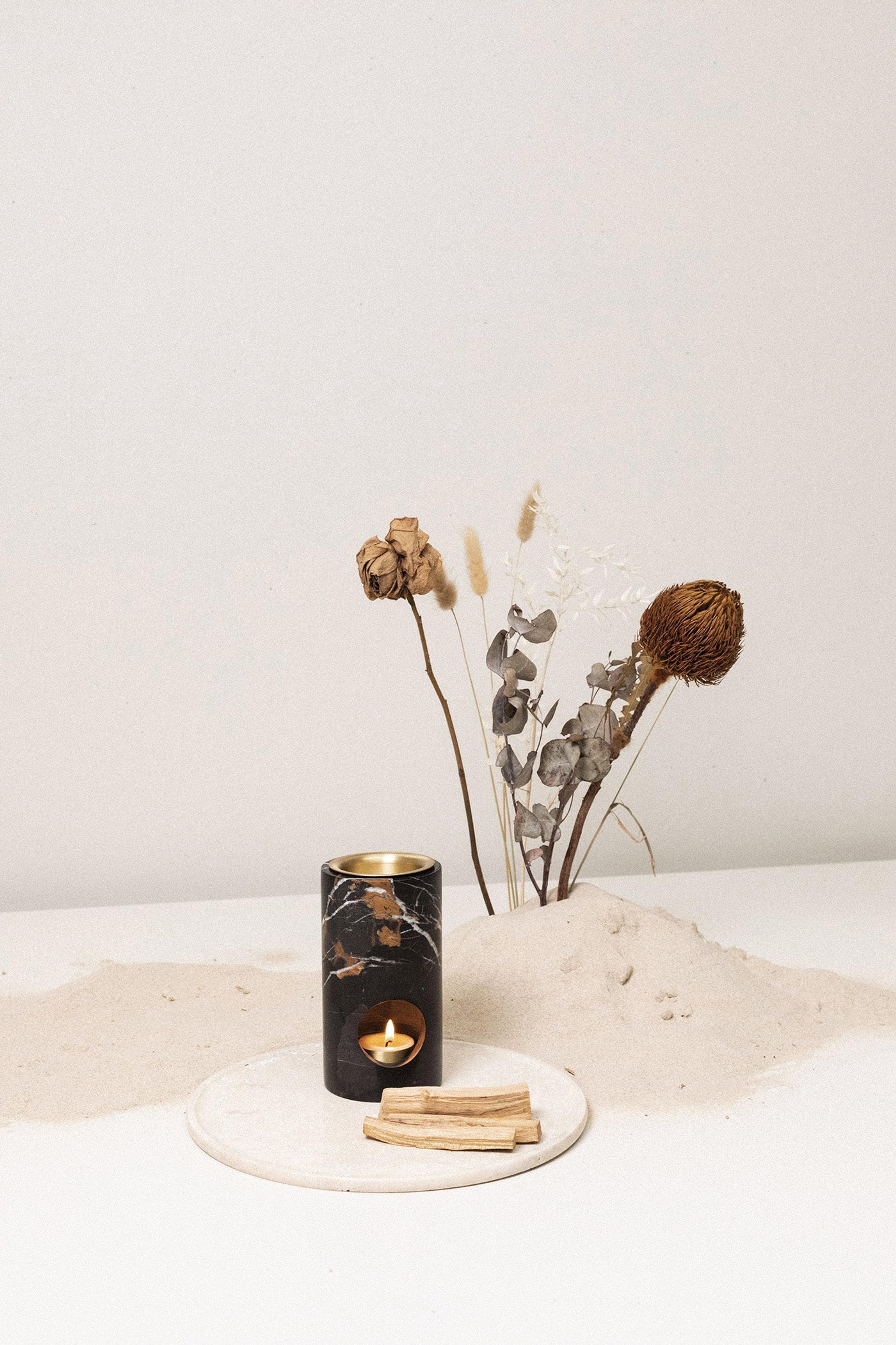 A minimalistic oil burner carved from solid stone featuring warm brass accents. This oil burners cylindrical design allows for the candle heat to directly warm the deep brass dish for enhanced aroma time. The Synergy Oil Burner comes with a 100% organic beeswax tea light candle and 15 mL Lavender essential oil. Available in Limestone, Travertine and Black Marble.