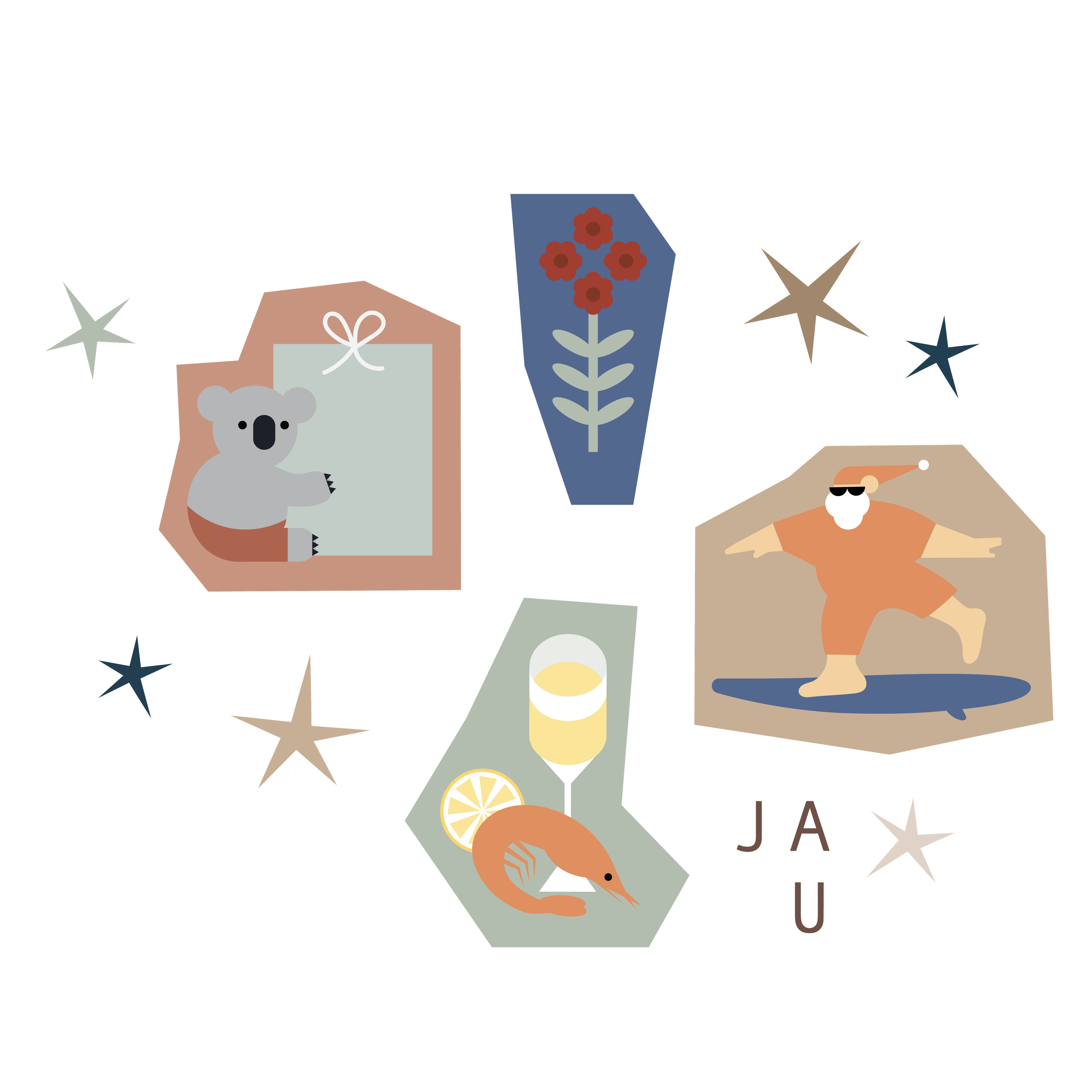 ホリデーギフトセットはJAUオリジナルコットンバッグに包んでお届けします。オーストラリアの太陽と砂浜をモチーフにしたデザインのバッグは、三重県の伝統工芸、伊勢型紙の技術を使って製作しました。JAUの代表ソニーが伊勢型紙の技術に感銘をうけ、デザイン、型紙製作から型染めまで行いました。オーストラリアと日本の文化の架け橋を目指すJAUならではのデザインとハンドメイドならではの風合いが楽しめるホリデーシーズン限定のバッグです。