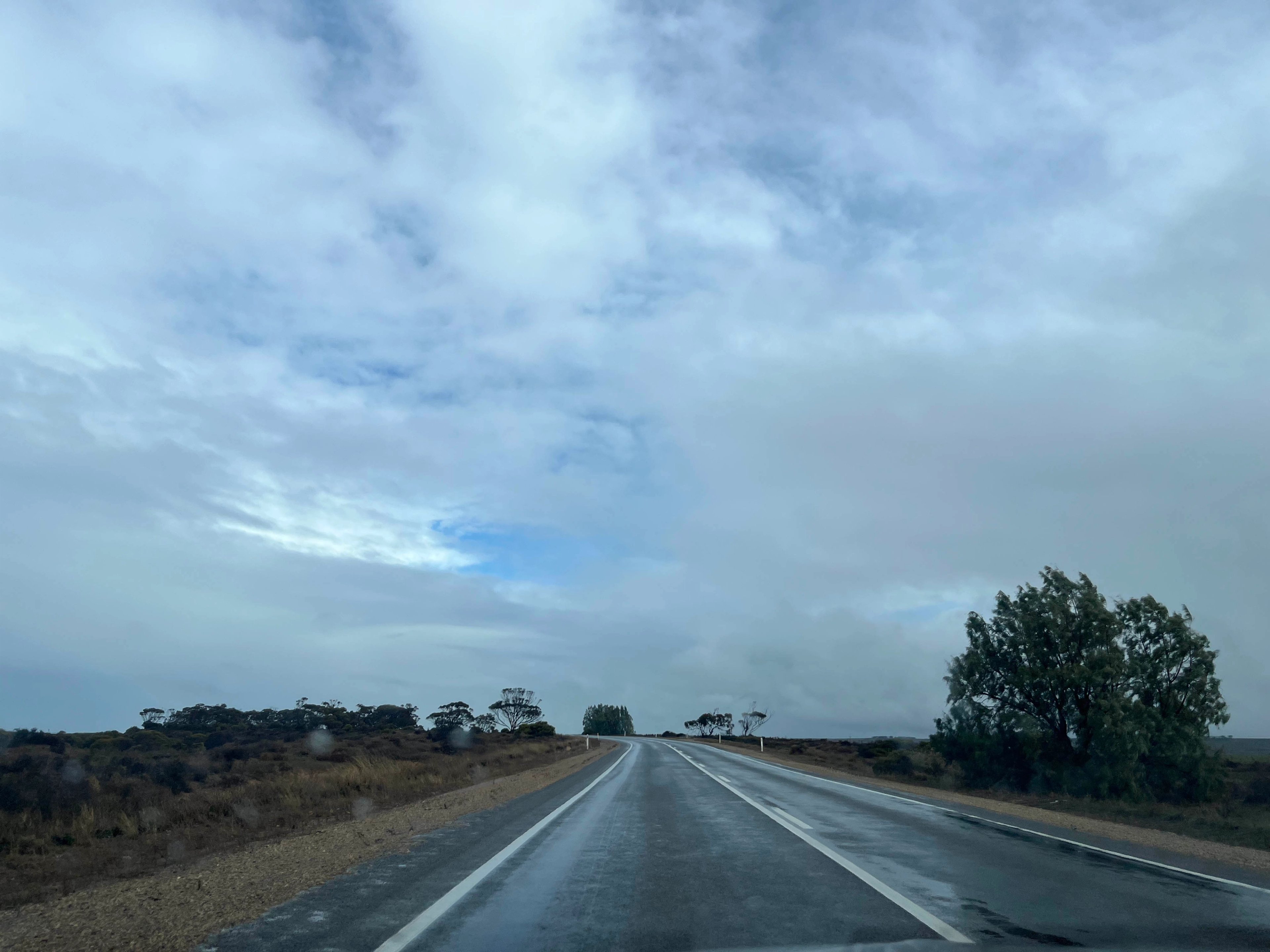 この日は残念ながらあまり天気に恵まれず、雨の中を走り続けました。アデレードの街を離れると、一気にこのような何もない状態に包まれます。感覚で言うと、例えば東京の渋谷駅から出発して30分後くらいにはこの様な状態です。写真には写っていませんが、周りには牛や羊、馬などがいます。いつ道を横切るかわからない野生のカンガルー達や、飛ばす地元ドライバーに気をつけながら運転します。
