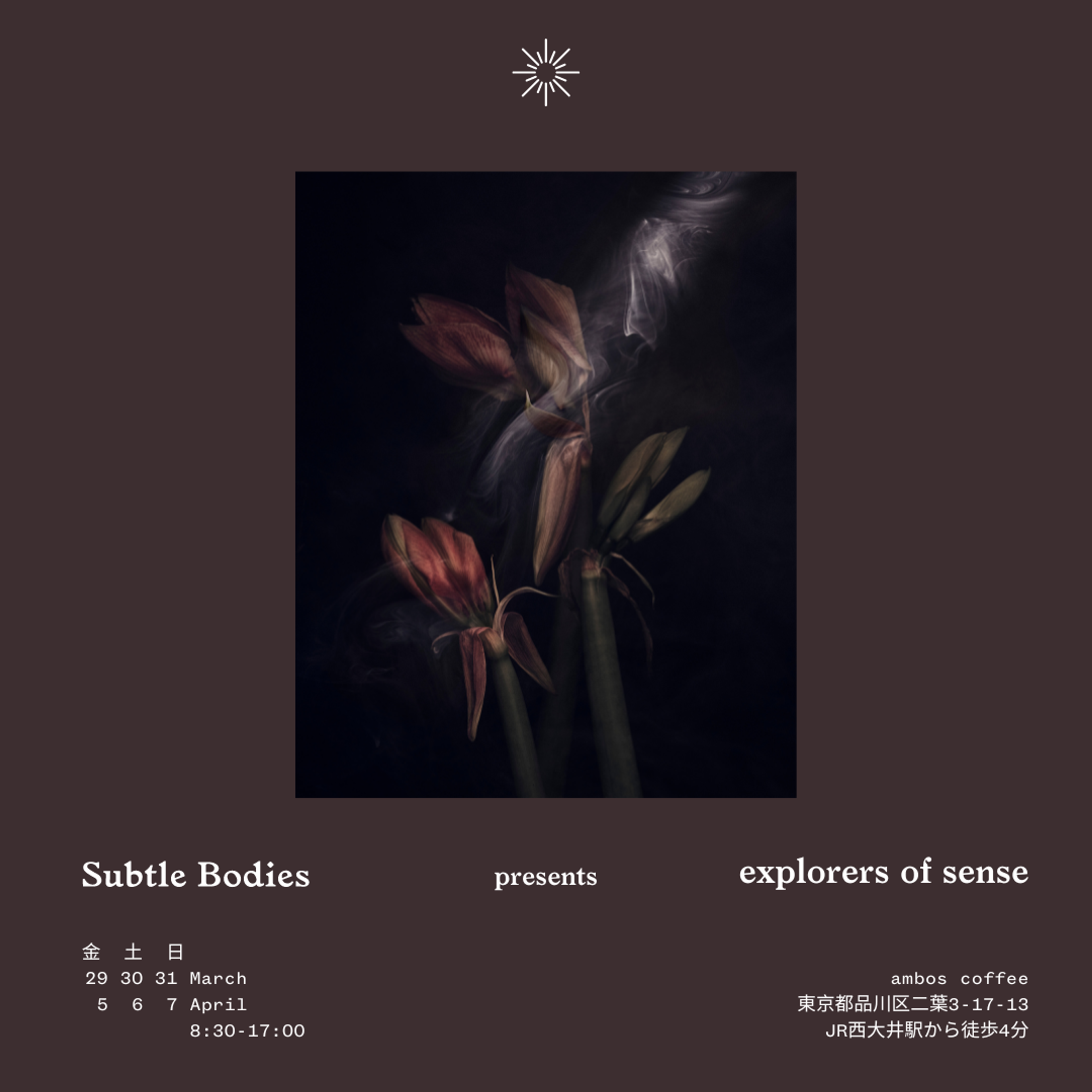今回、イベントでコラボレーションした、ambos coffee(ギャラリー/コーヒー)、菓子 瑞(御菓子)、春の雨(サウンド)の3名に、自身が探求し続けるもの、Subtle Bodiesをイメージしたコンテンツについてお話を伺いました。