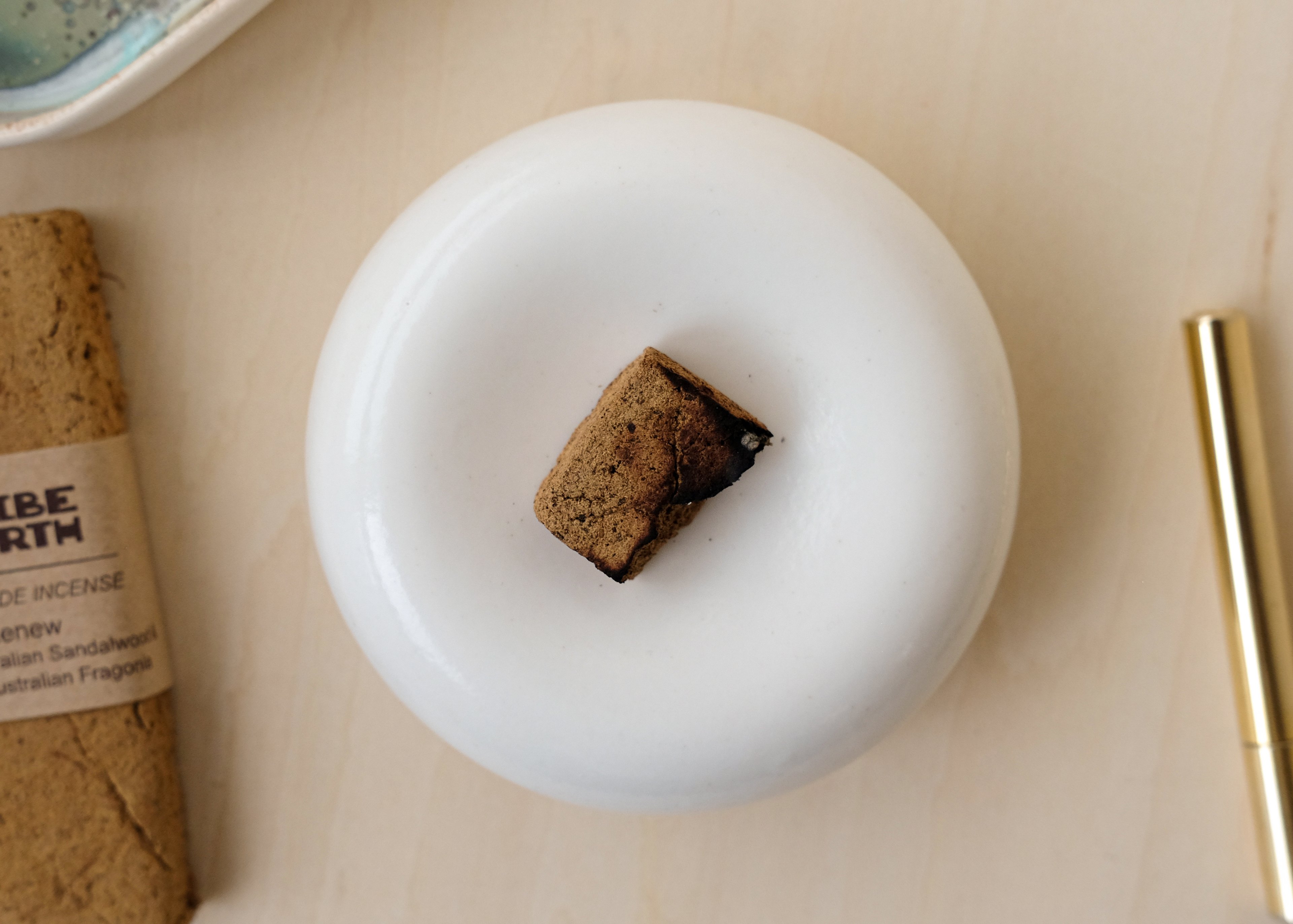Ritual Dishは手のひらサイズの真っ白な磁器製のお香/小物置き皿です。JAUの商品の中でも人気の高い、自然派お香ブランドTribe Earthの置き皿としてカスタムをし、製作していただきました。手に馴染むベーグルのような、ぷっくりとした形に薄く透明な釉薬をコーティングしており、滑らかな丸みを強調させるような仕上がりになっています。お香だけではなく、指輪などの小さなアクセサリー置きとして使うのも素敵です。