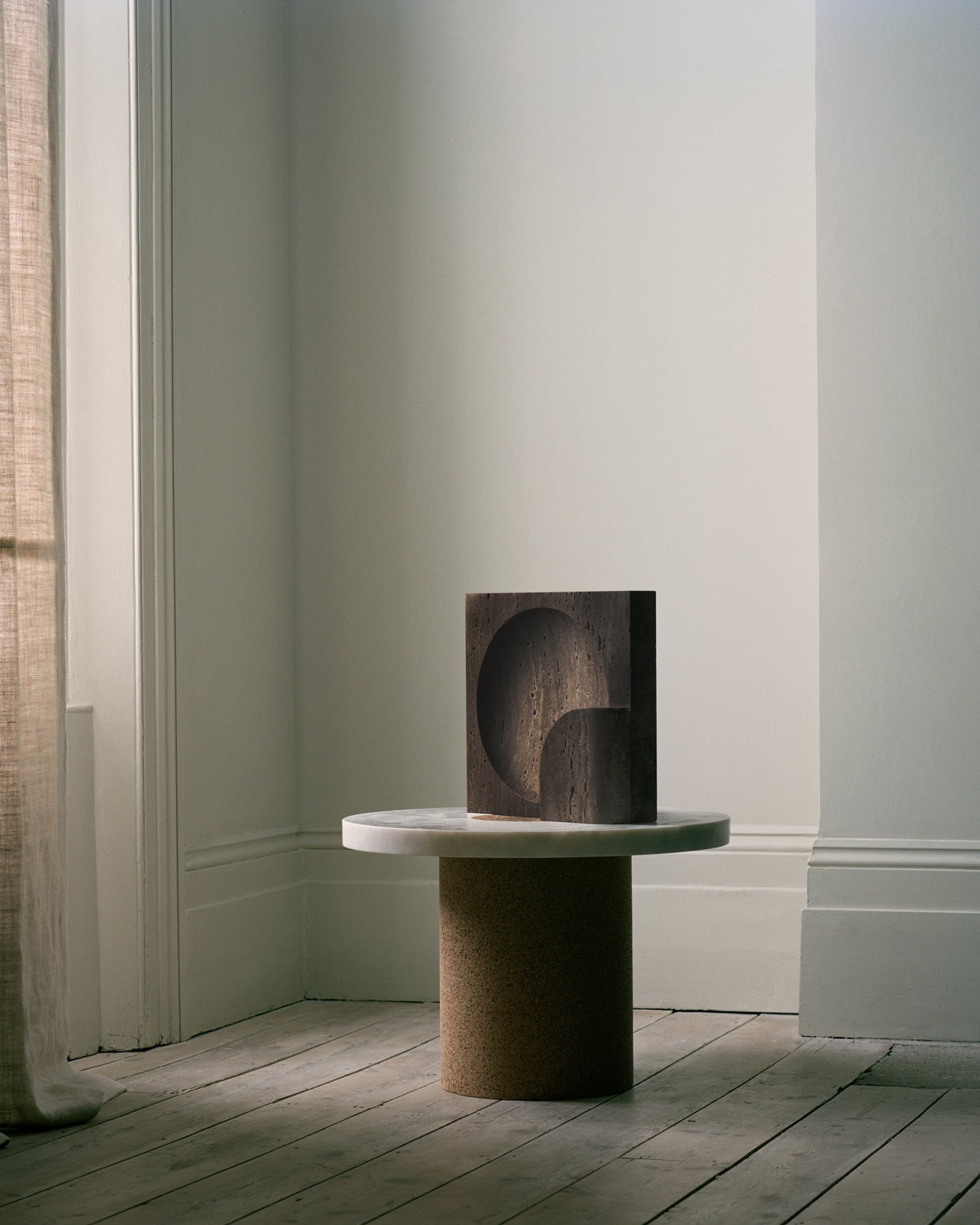 エレガントでミニマルなフォルムと、緩やかなアシンメトリーが特徴のランプ。2枚の天然石を、外からは見えないような設計でつないでいます。前板の曲線と、後板の円形にくぼんだ正方形。幾何学的なコントラストをお楽しみください。