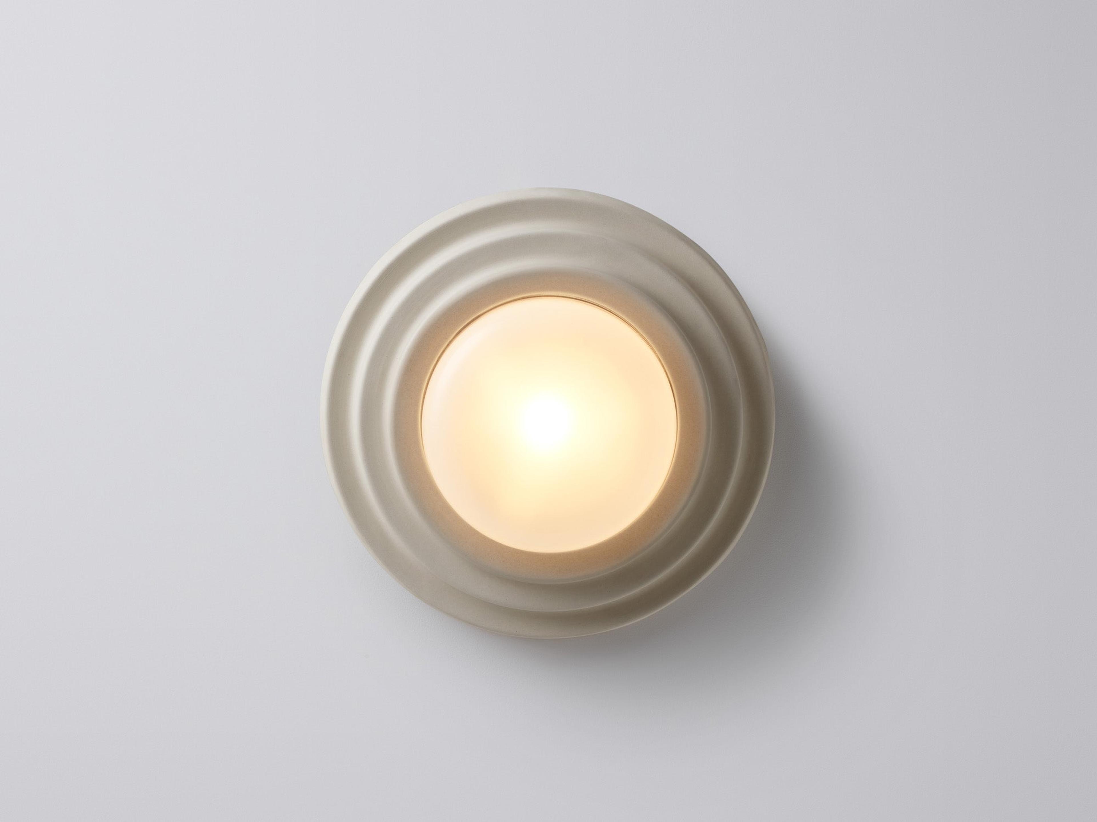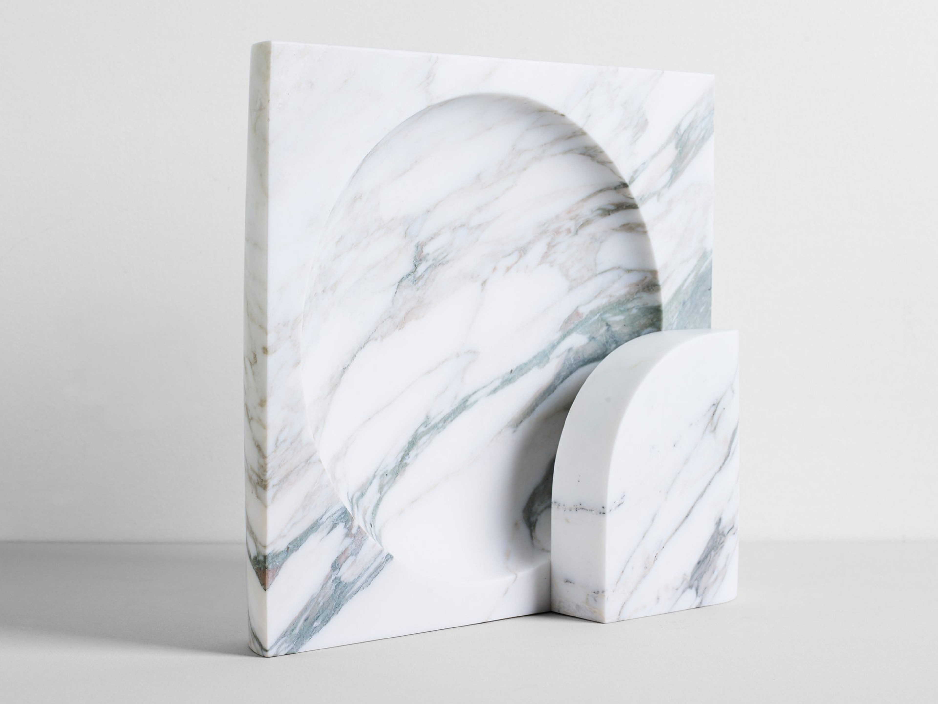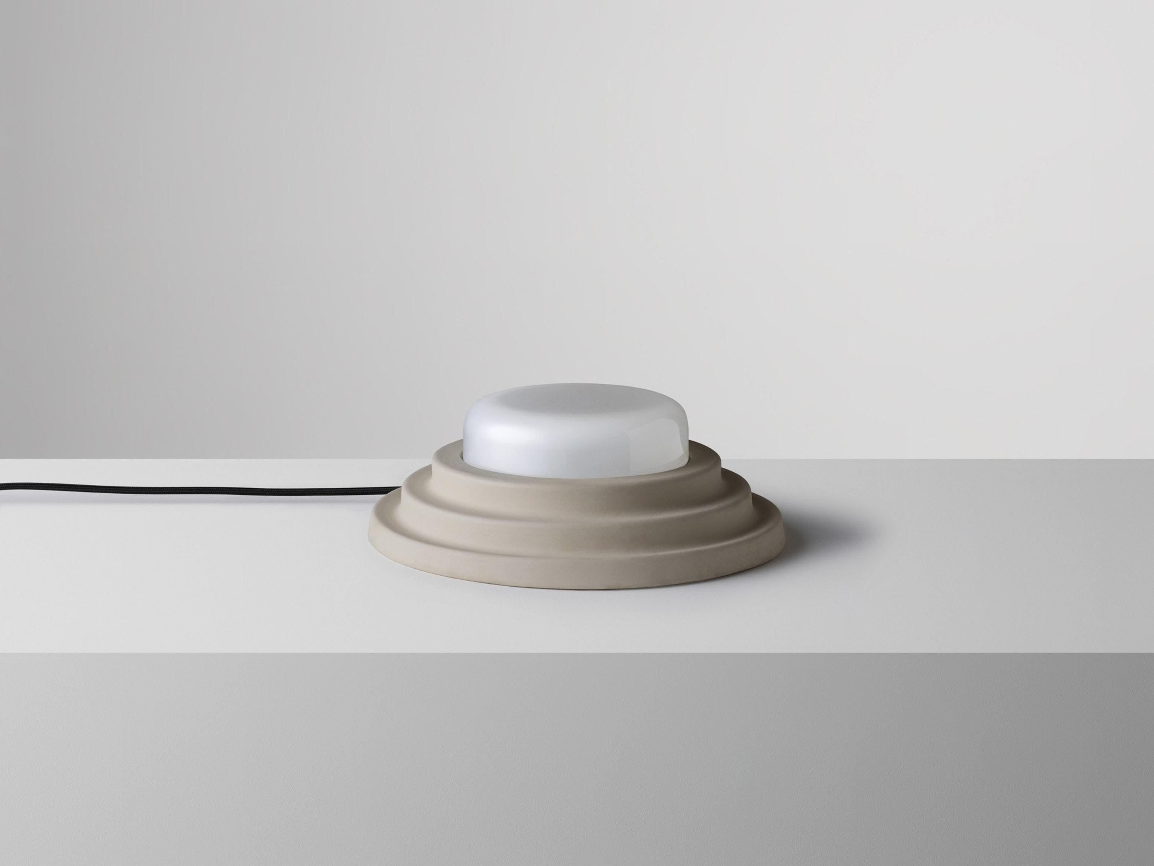 エレガントでミニマルなフォルムと、緩やかなアシンメトリーが特徴のランプ。2枚の天然石を、外からは見えないような設計でつないでいます。前板の曲線と、後板の円形にくぼんだ正方形。幾何学的なコントラストをお楽しみください。