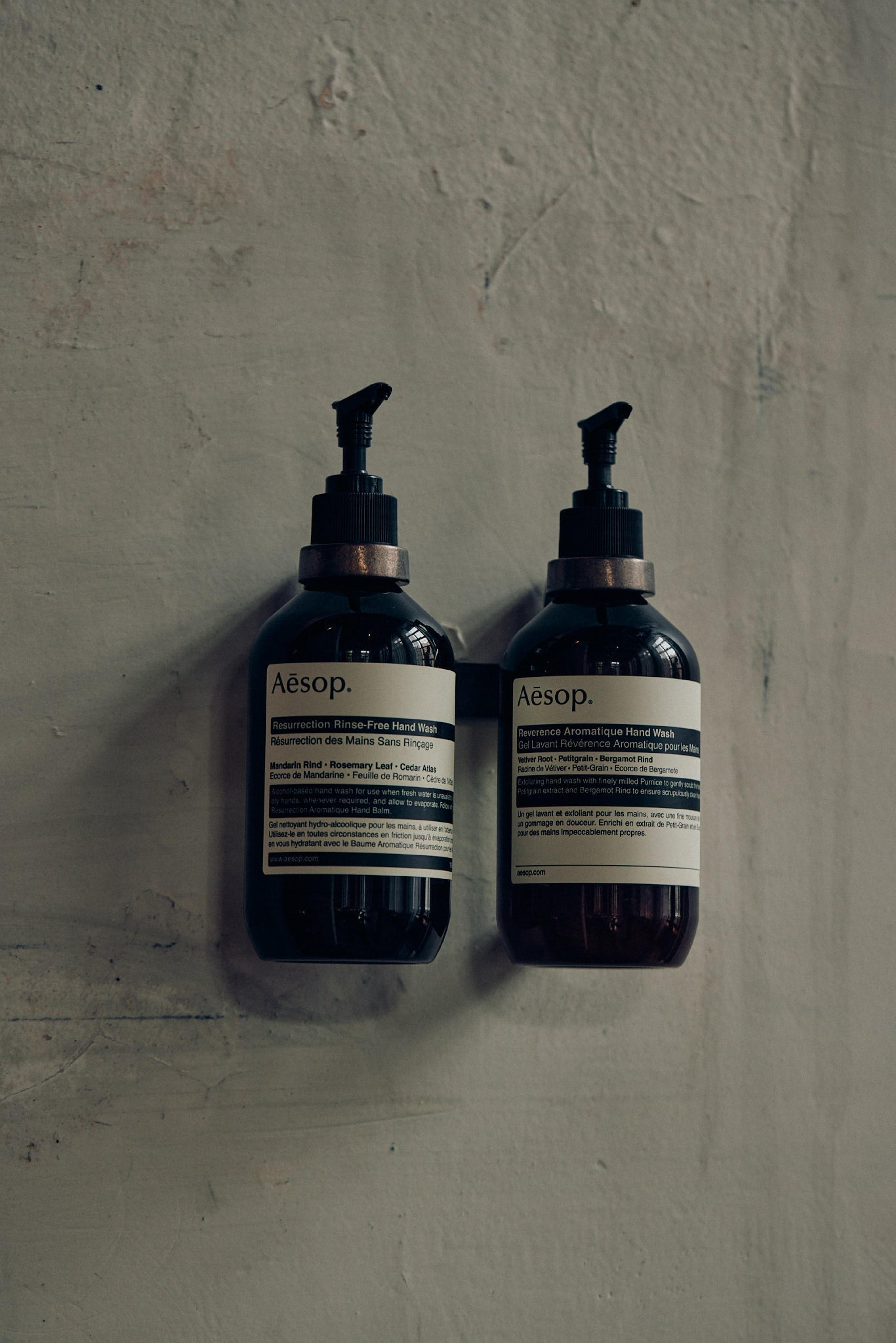 Aesopボトルホルダーはハンドソープやシャンプーなどのボトルを壁などに設置するための器具です。アルミニウムを型に注いで作られており、1本用と2本用と2本用をご用意しております。