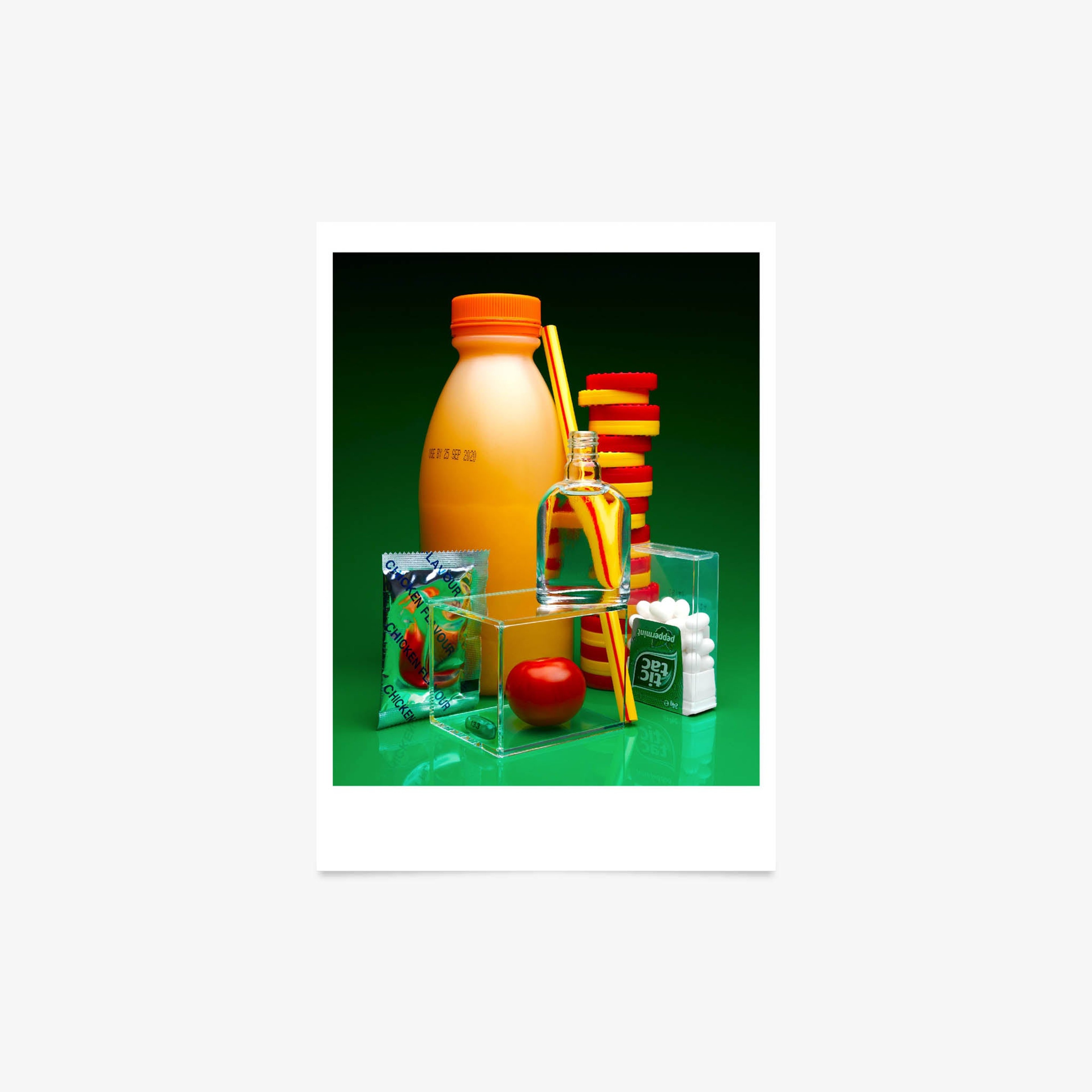 Composition #4 (Basic Colour Theory) with Orange Juice, Connect Four Counters, Clear Nail Polish, Drinking Straw, Half Eaten Box of Tic Tacs, Cherry Tomato, Liquid Ibuprofen Capsule, and Flavour Sachet, 2020